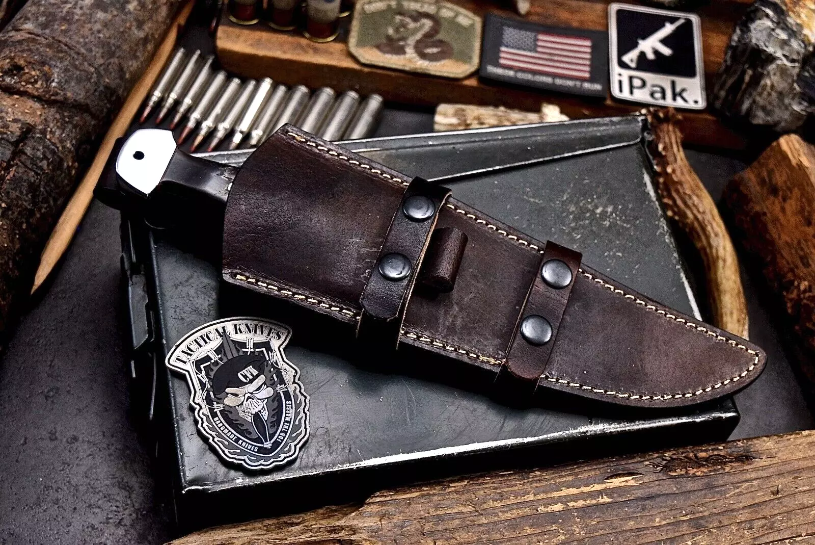 When done using the knife, wash it in soap and water, dry completely, coat in olive oil and store away from the sheath. Leather pulls moisture out of the air and can rust the blade and bolsters if stored improperly.