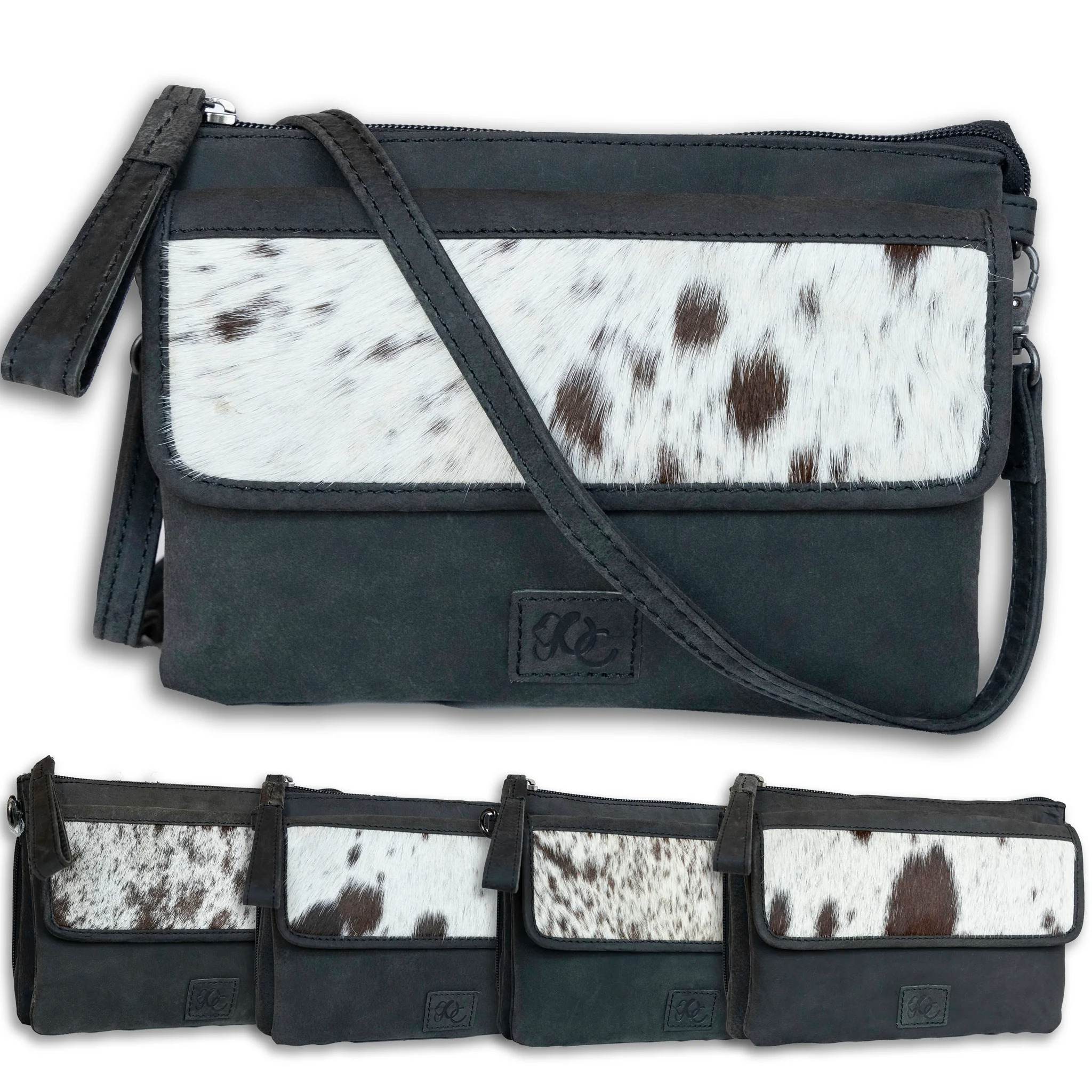 The stunning Bobbie Crossbody is crafted with full-grain leather and has a beautiful, unique hair-on texture on the front pocket. The front button pocket features RFID card slots and has another button pocket behind it which is great for cell phones or other quick access necessities. The main zipper pocket has plenty of additional storage space. The pocket opens up and splits into 3 compartments. There is a slip pocket in the front most compartment and a zippered pocket in the back compartment. There is also a leather strap for keys. The adjustable crossbody strap measures 29”-55” with a 14”- 27.5” drop.