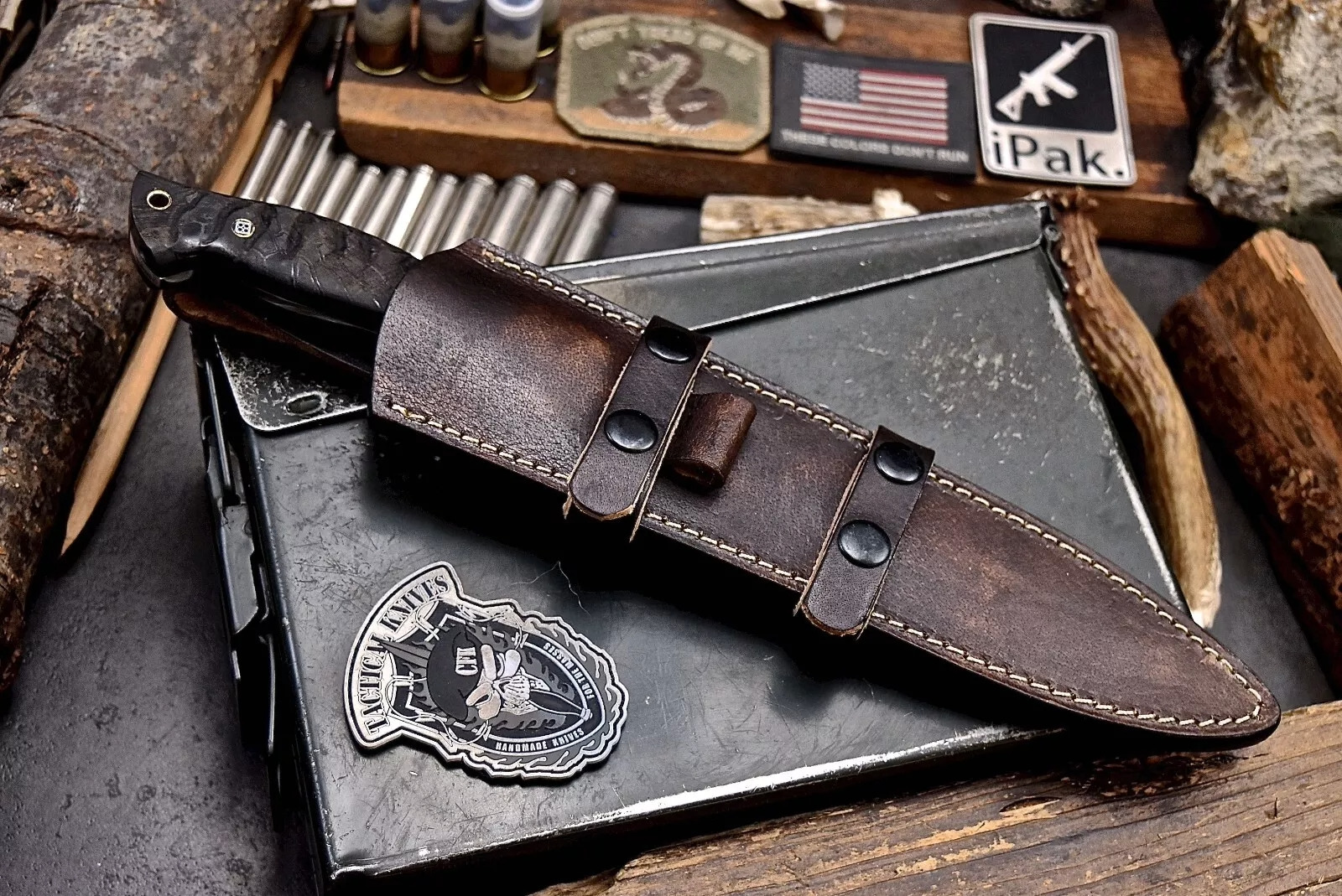 D2 Tool Steel is a high-carbon, high-chromium, air-hardening tool steel that is characterized by a relatively high attainable hardness and numerous, large, chromium-rich alloy carbides in the steel. D2 provides an effective combination of wear resistance and toughness. D2 holds an edge very well. When needed, use a Diamond Wet Stone or better to re-sharpen the blade at 20-degrees. When done using the knife, wash it is soap and water, dry completely, coat in gun oil and store away from the sheath. Leather pulls moisture out of the air and can rust the blade if stored improperly.